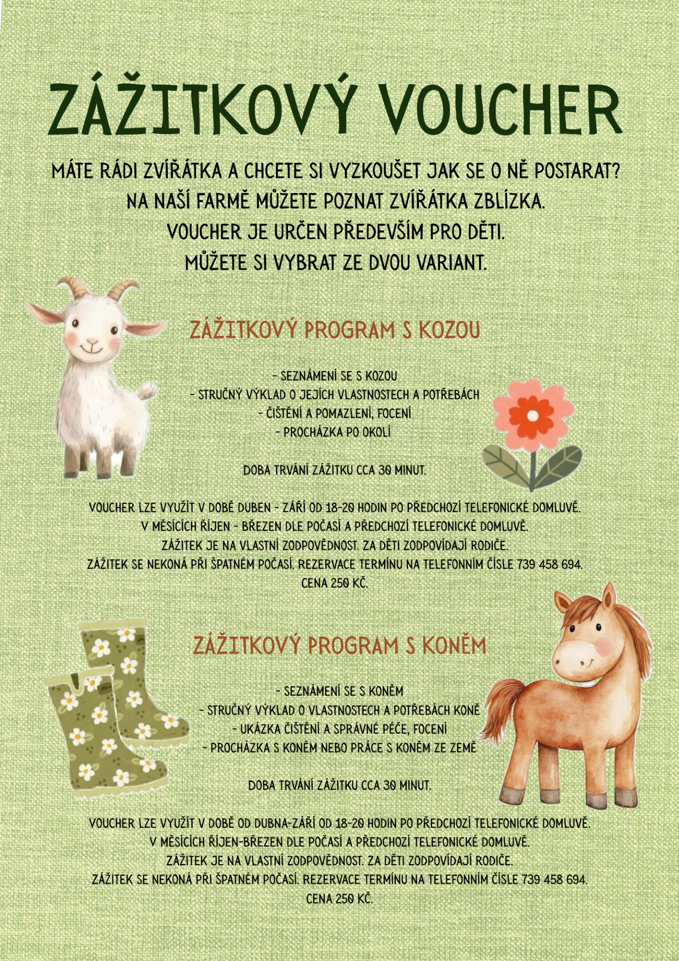 Součástí volnočasového centra je i prodej ze dvora (farmářské produkty). Můžete zde koupit kozí mléko, čerstvé kozí sýry, vajíčka.